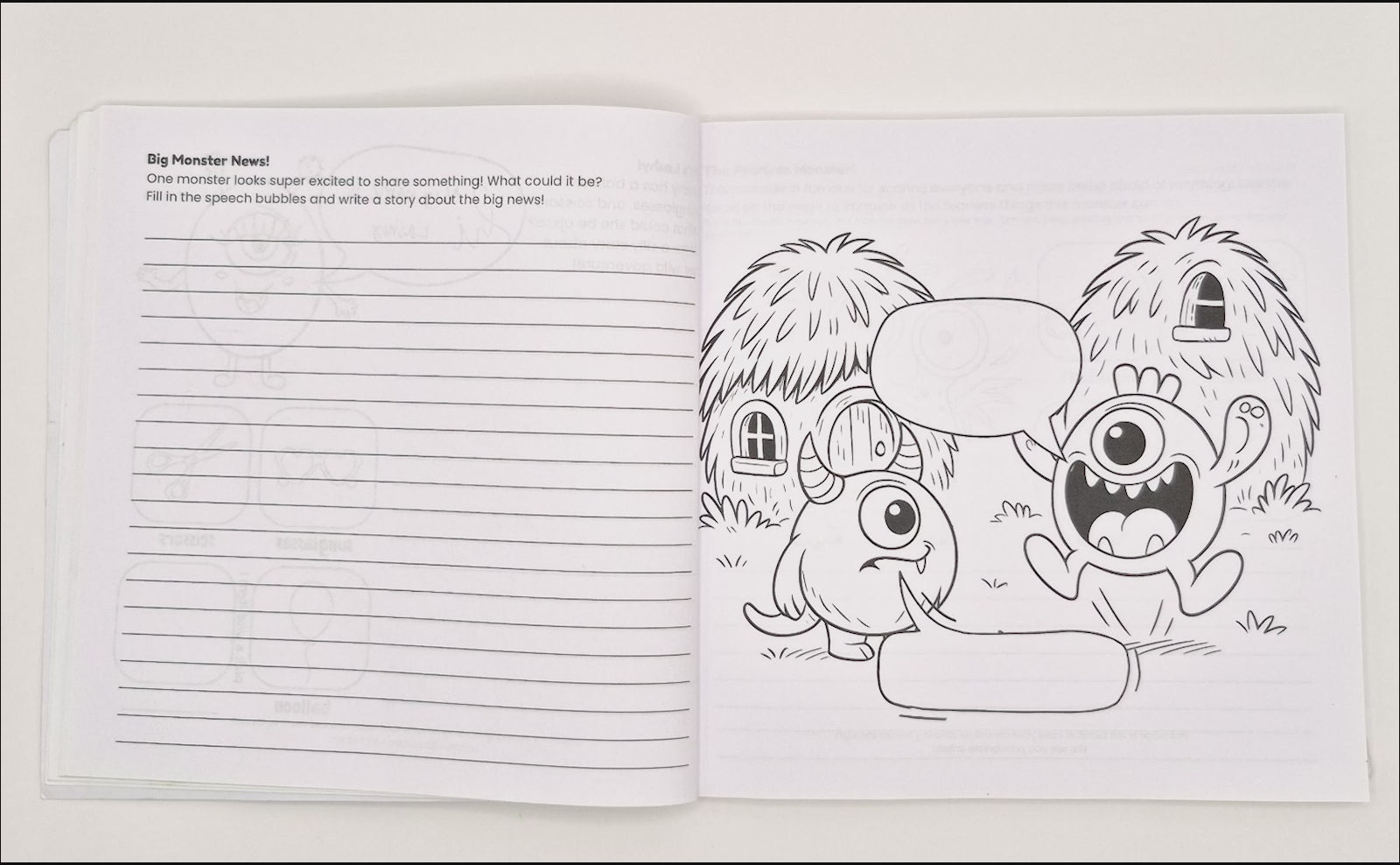 Monster Coloring Tales is a wildly creative monster coloring book for kids aged 4–8. Packed with detailed monster scenes, fun writing prompts, and imaginative story starters!