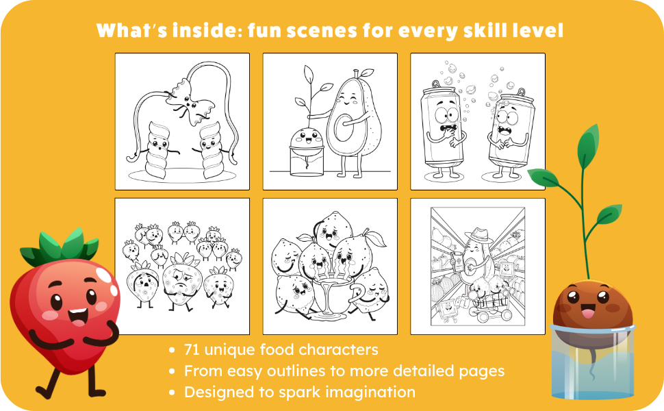 71 unique food character scenes to colour
