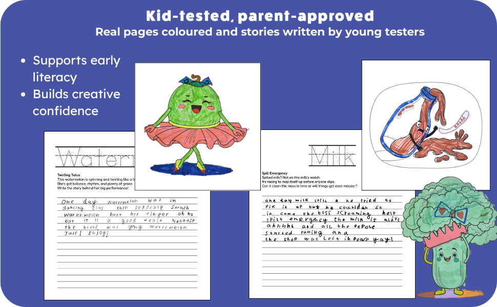 My Foodie Tales: Colour, Trace & Write Stories is a fun and interactive activity book for kids aged 3 and up. Bursting with hand-drawn funny food characters and open-ended story prompts, it’s a playful way to build creativity, boost early writing skills, and spark storytelling confidence.